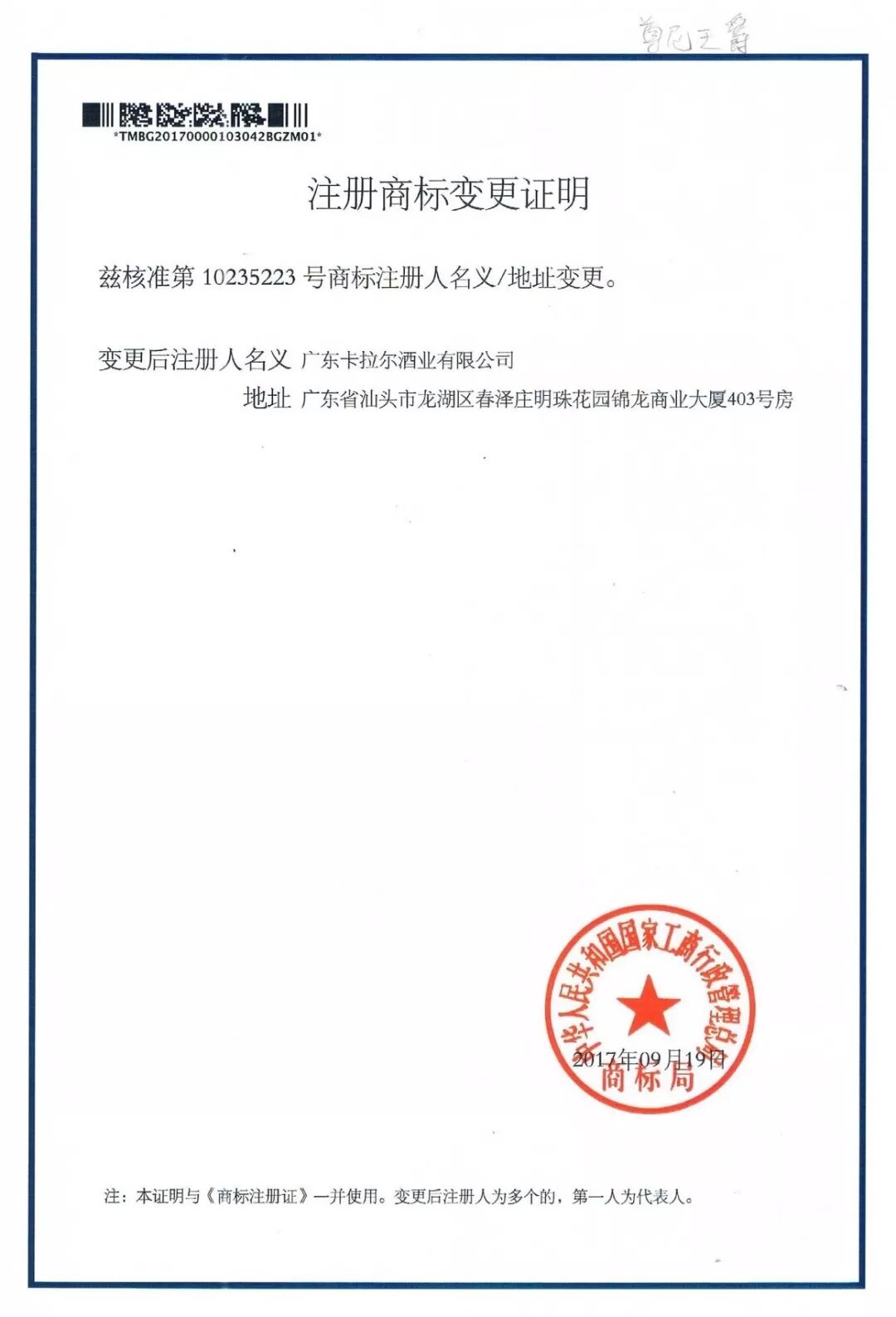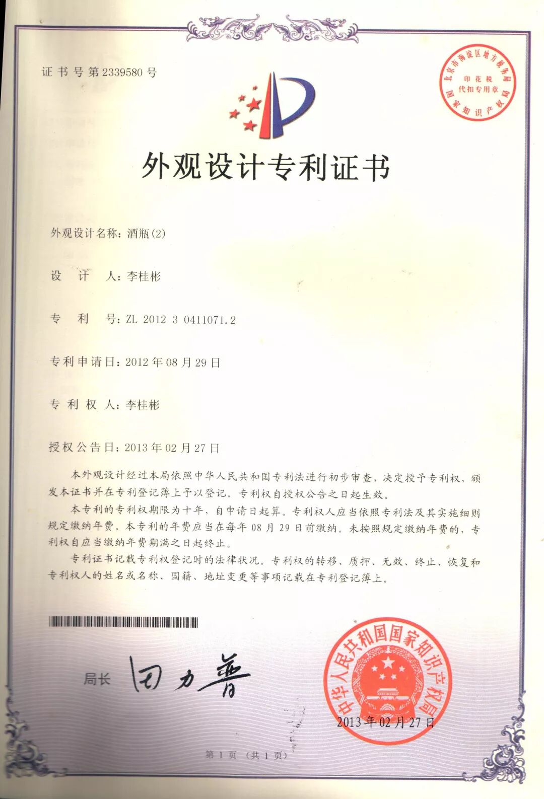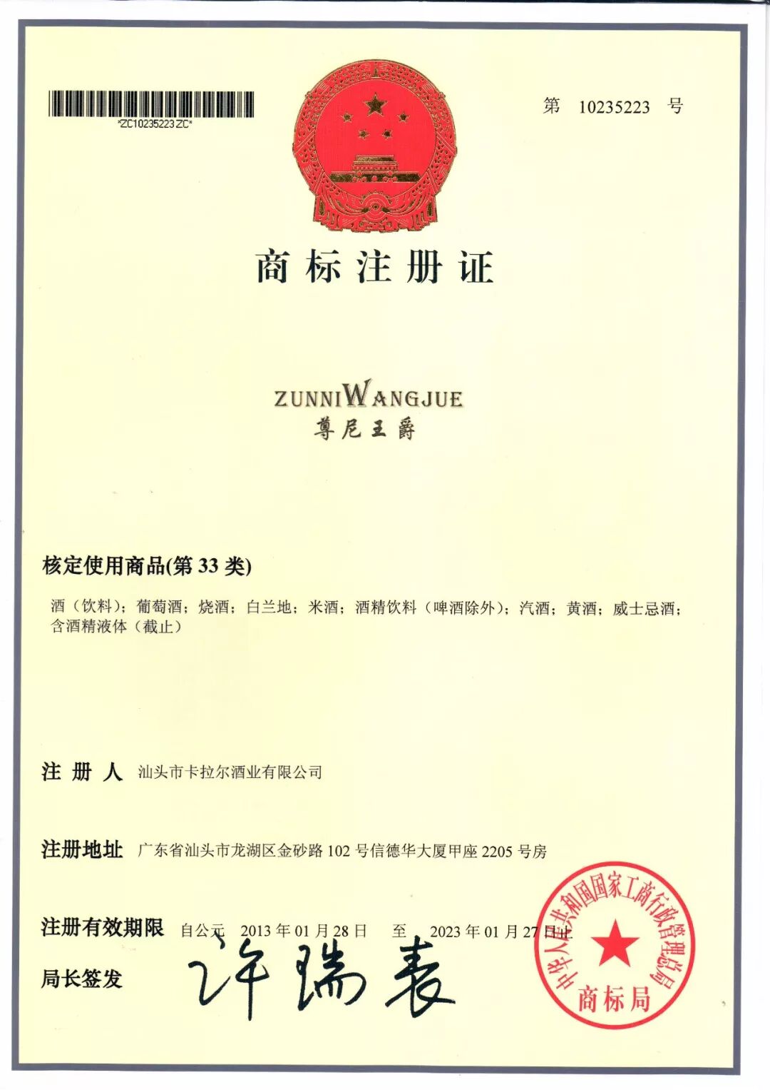 公司成立之初,广东卡拉尔酒业有限公司就已经意识到了企业品牌和产品专利的重要性,在2012年完成尊尼王爵·卡爵XO白兰地产品酒瓶外观设计时,就递交专利申请,并在2013年获得外观设计专利证书,专利号是ZL 2012 3 0411071.2。